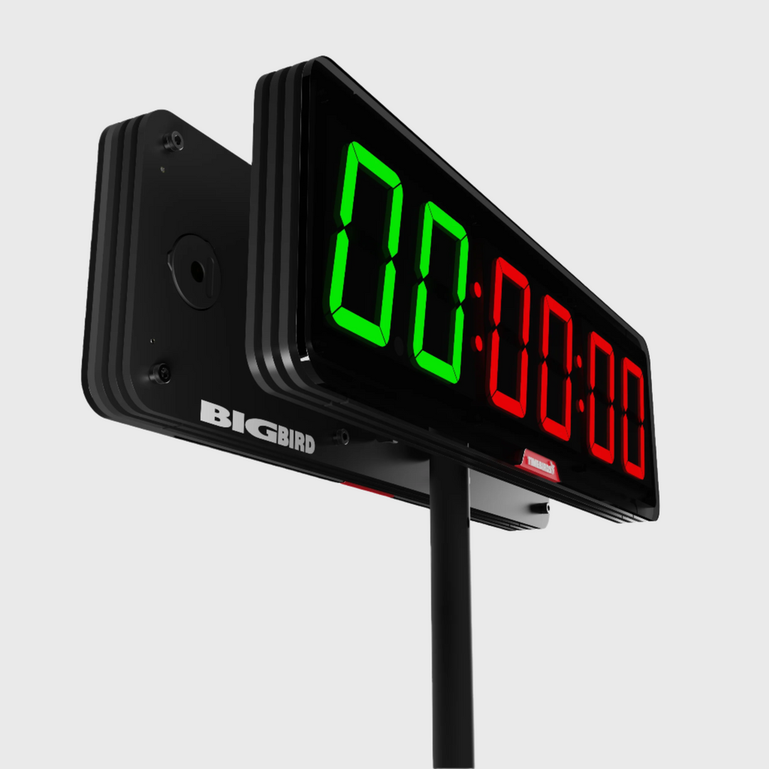 The Timebirds floor stand is a sturdy yet lightweight tripod designed to securely hold one or two BigBird timers, facing in opposite directions. It can be adjusted in height from 1m to 1.8m. The Timebirds floor stand comes equipped with an adaptor onto which you can attach the mounting bracket provided with the BigBird timer.